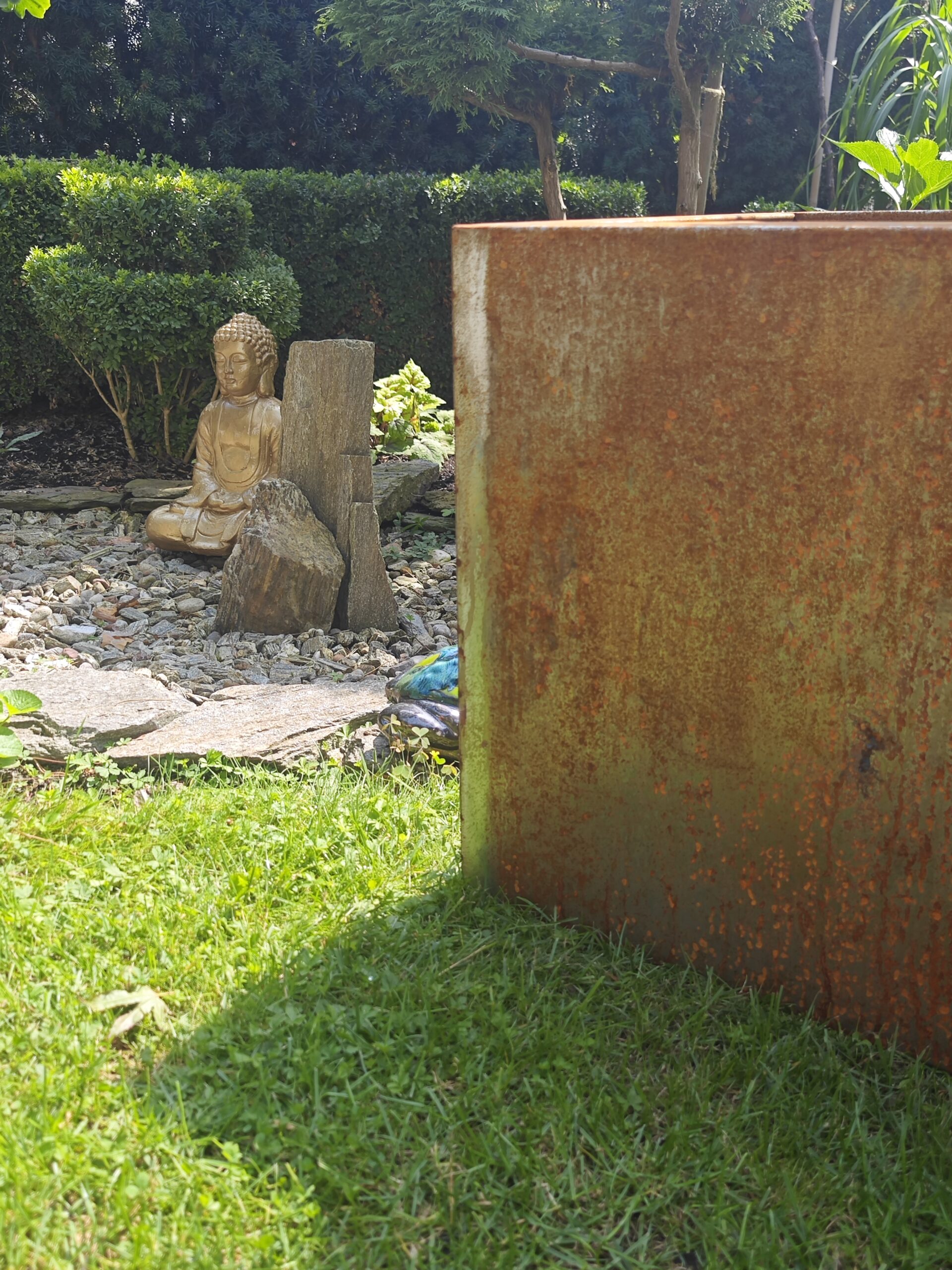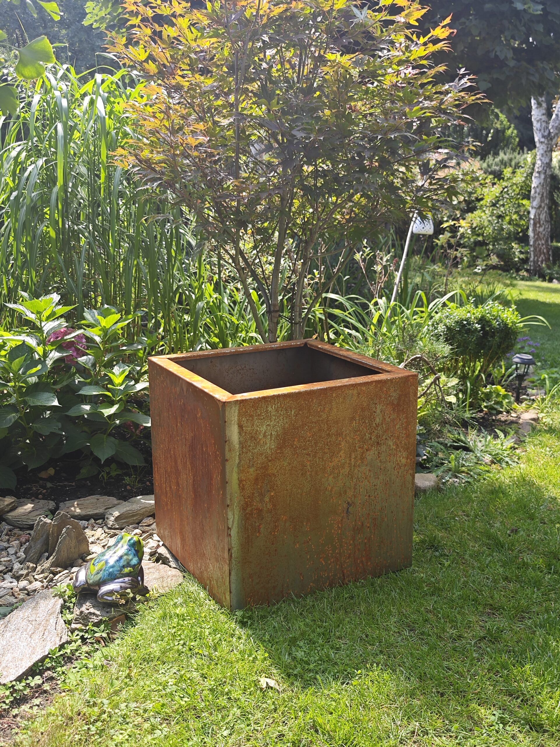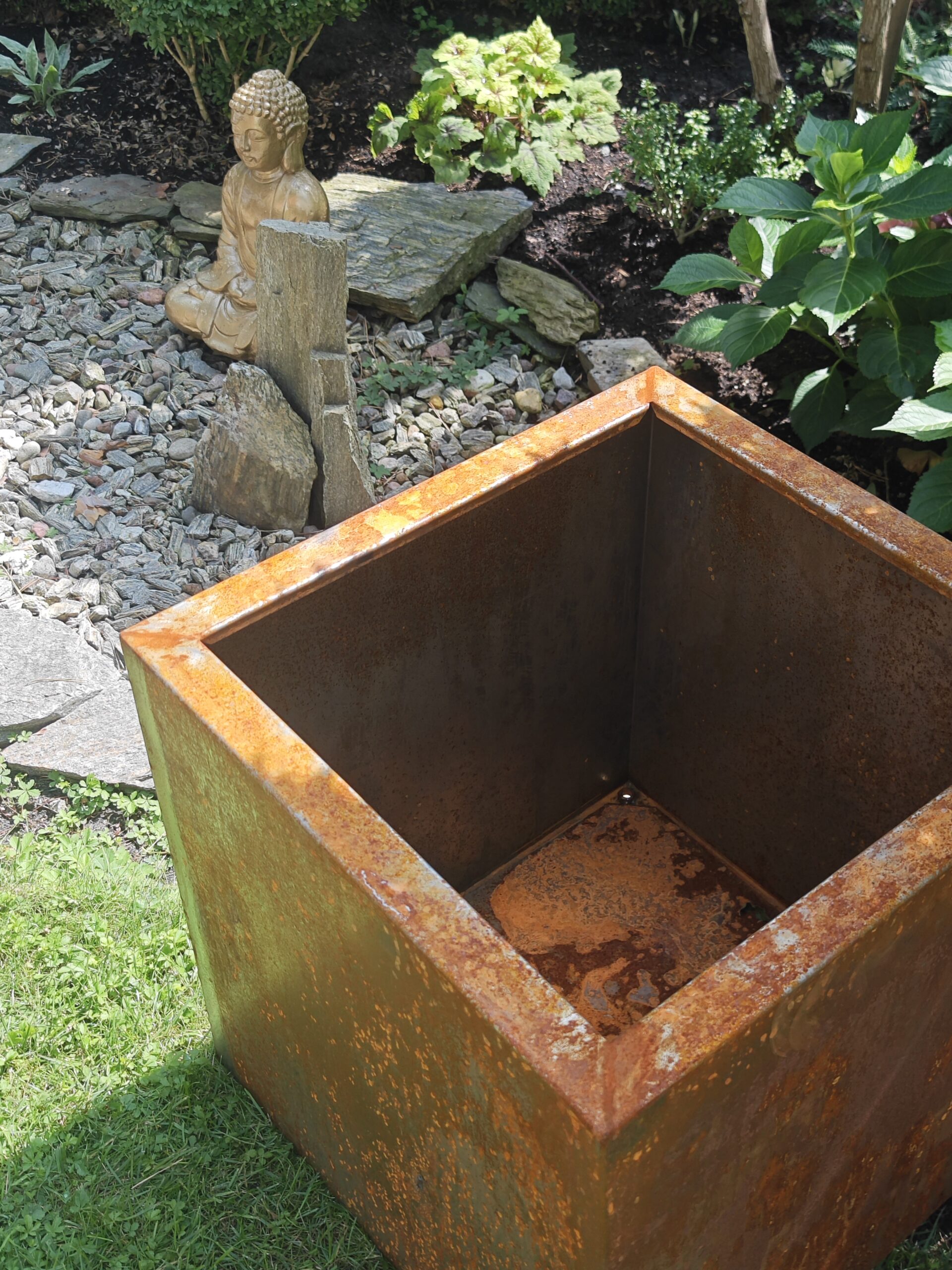 Każdy egzemplarz jest jedyny w swoim rodzaju — różnice w strukturze i odcieniu rdzy sprawiają, że każda donica ma własny charakter.
