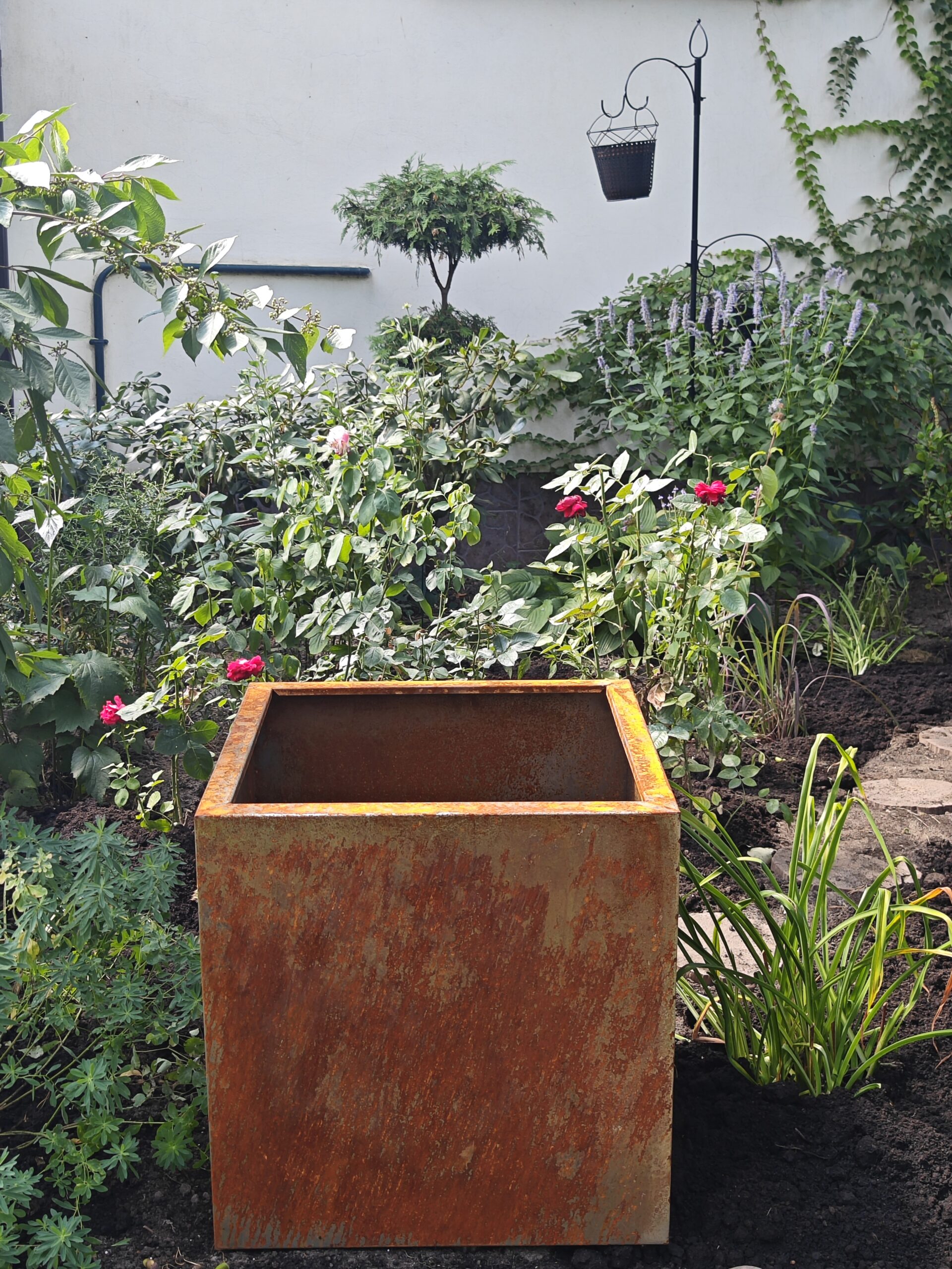 Każda donica jest niepowtarzalna — jej odcień, faktura i układ rdzy zmieniają się w czasie, tworząc unikalny efekt naturalnego starzenia.
