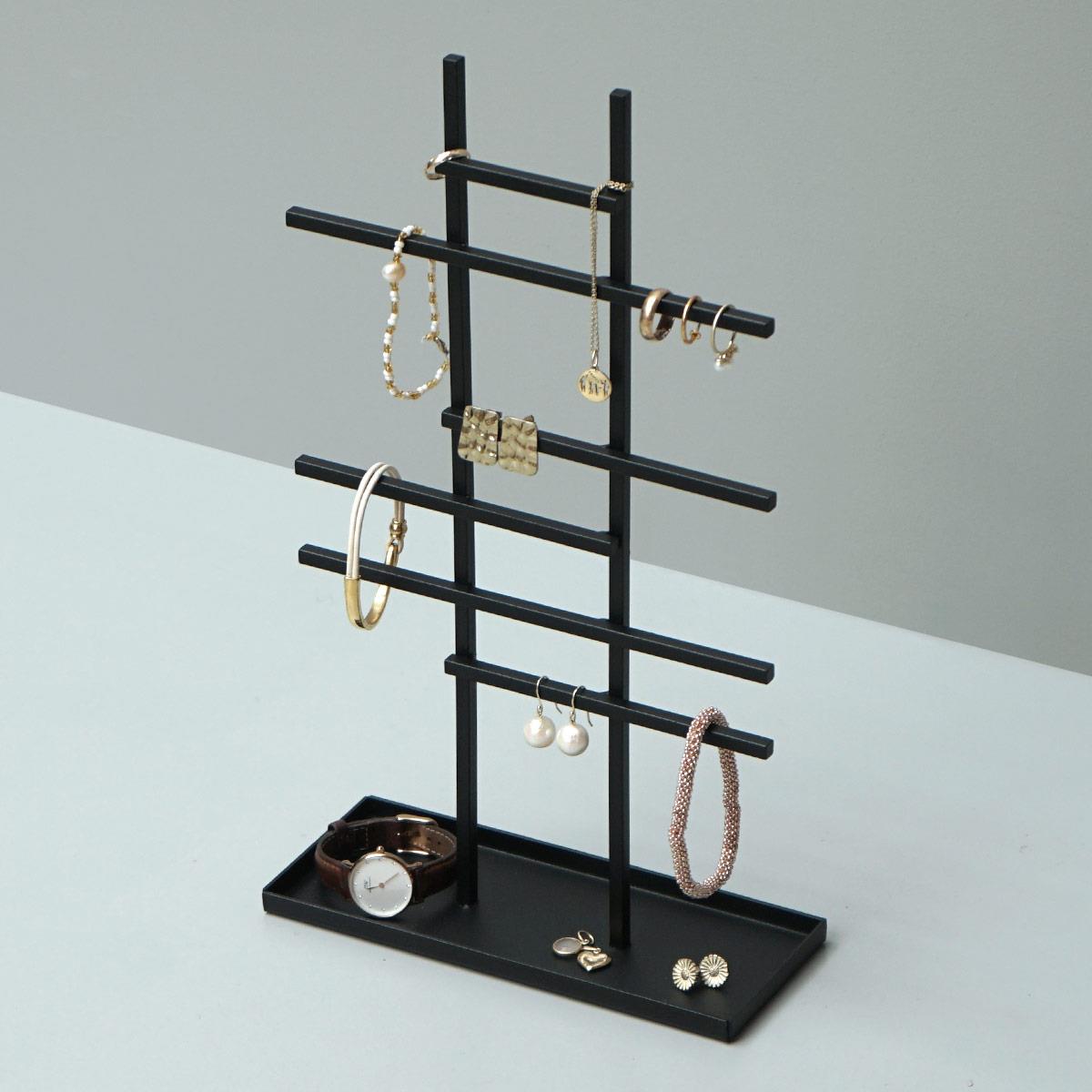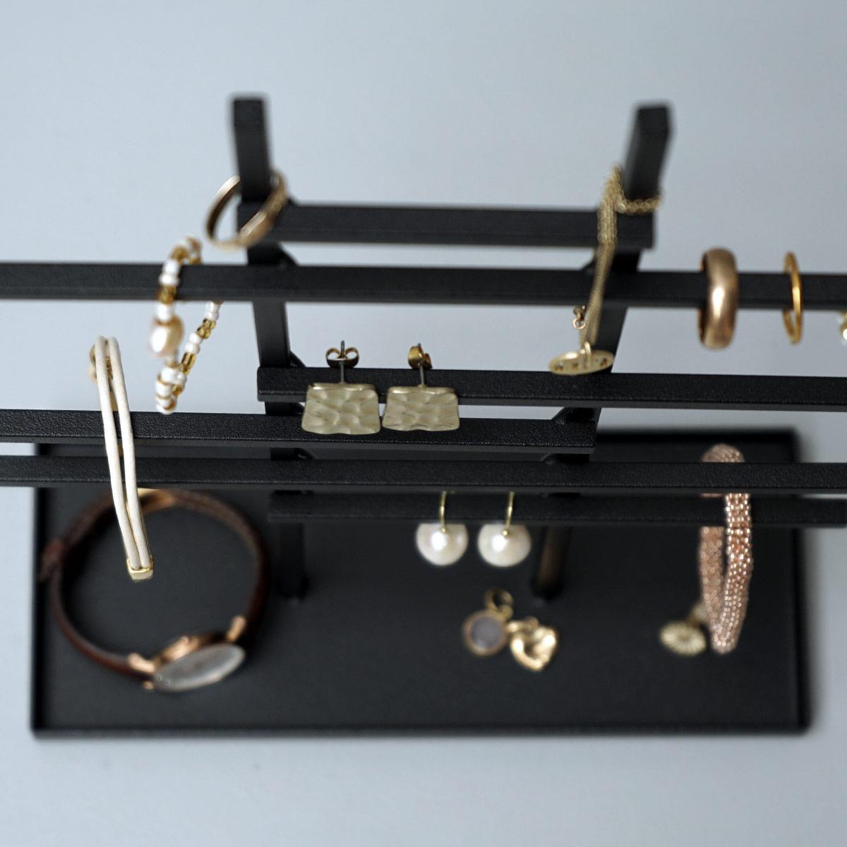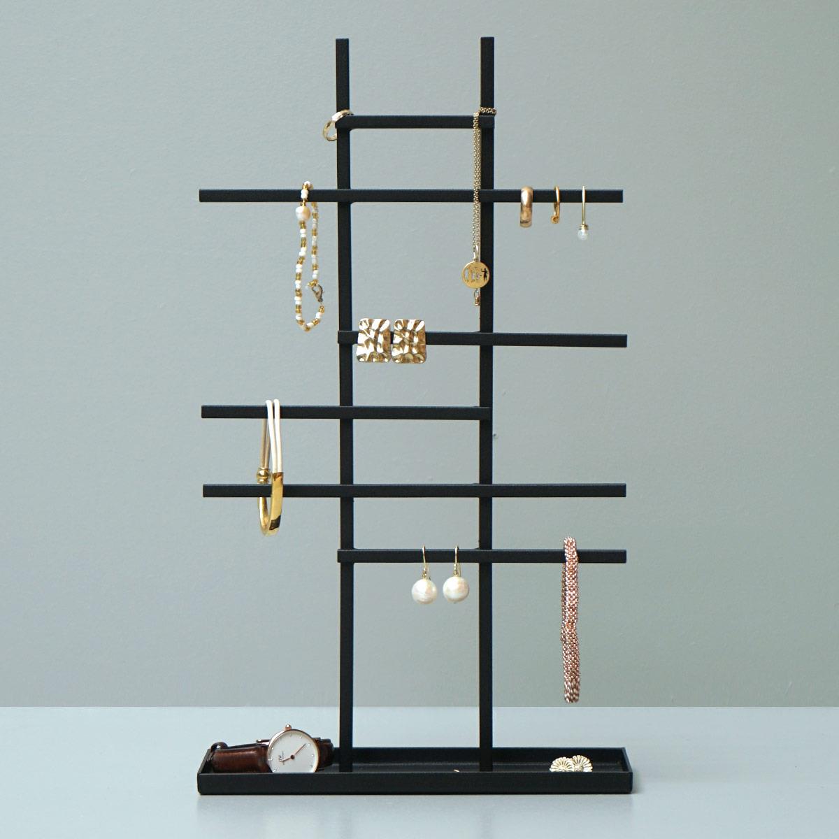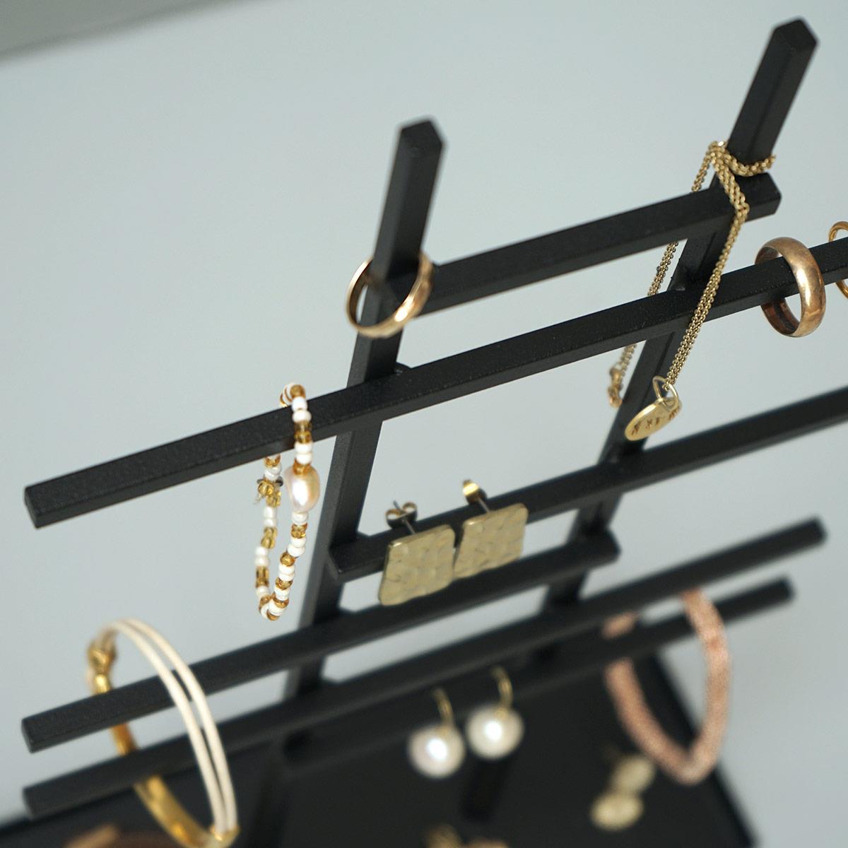 PRECIOUS to elegancki stojak na biżuterię od LookNorth, który pozwala w estetyczny i uporządkowany sposób przechowywać pierścionki, bransoletki, naszyjniki czy kolczyki. Trzy poziome ramiona na różnych wysokościach umożliwiają wygodne zawieszenie i wyeksponowanie ulubionych ozdób – bez splątań i szukania w pudełkach.
