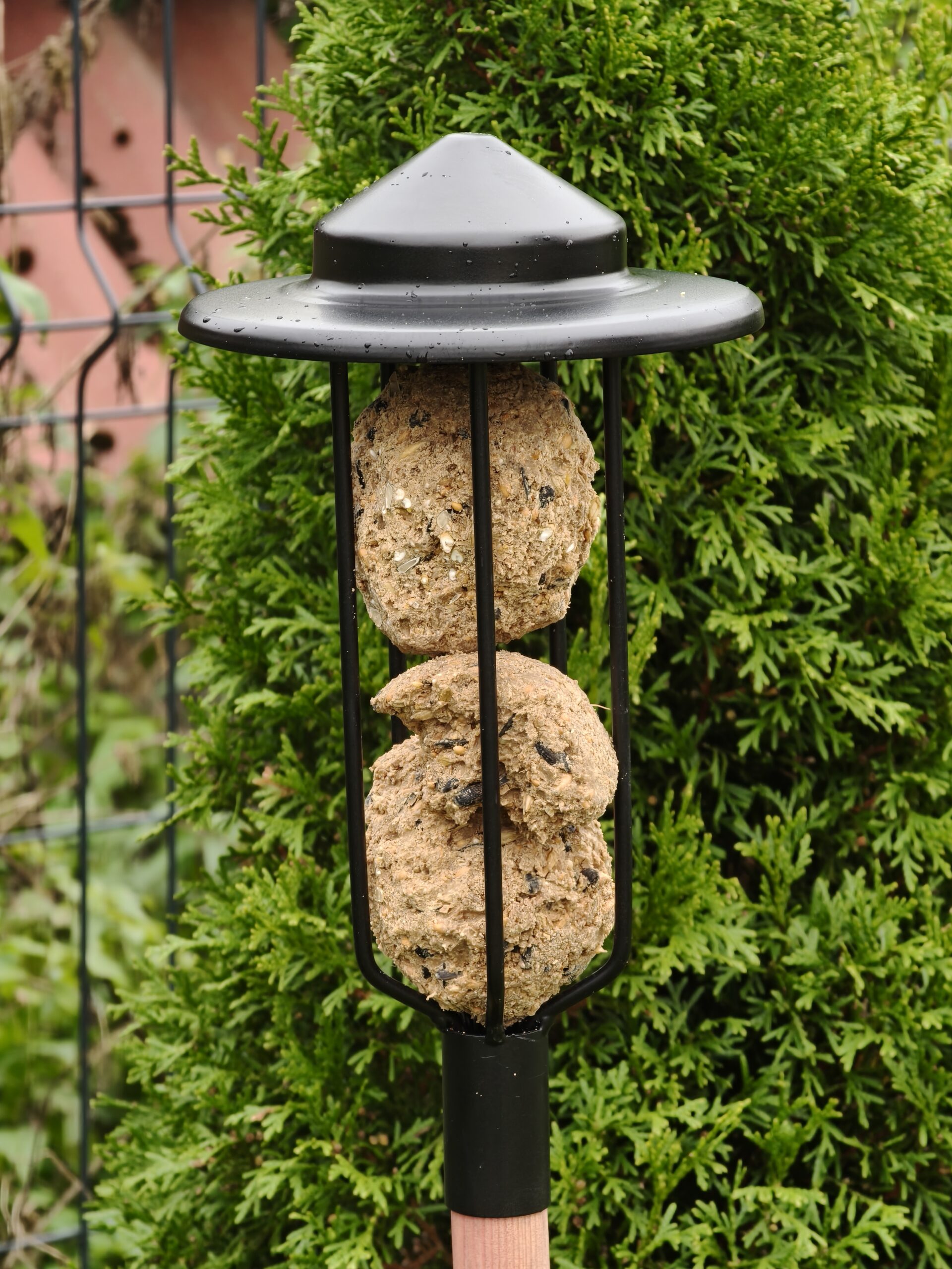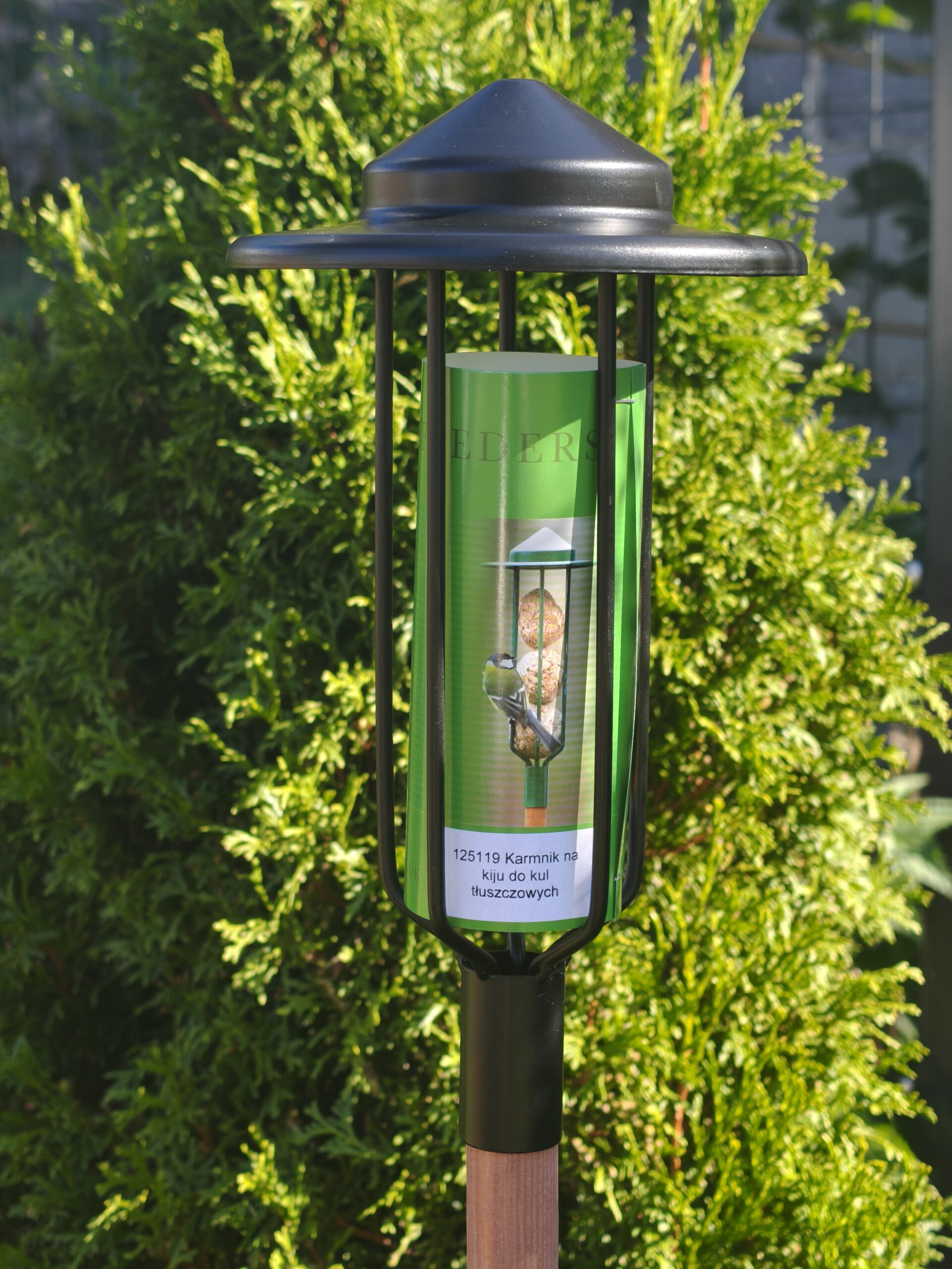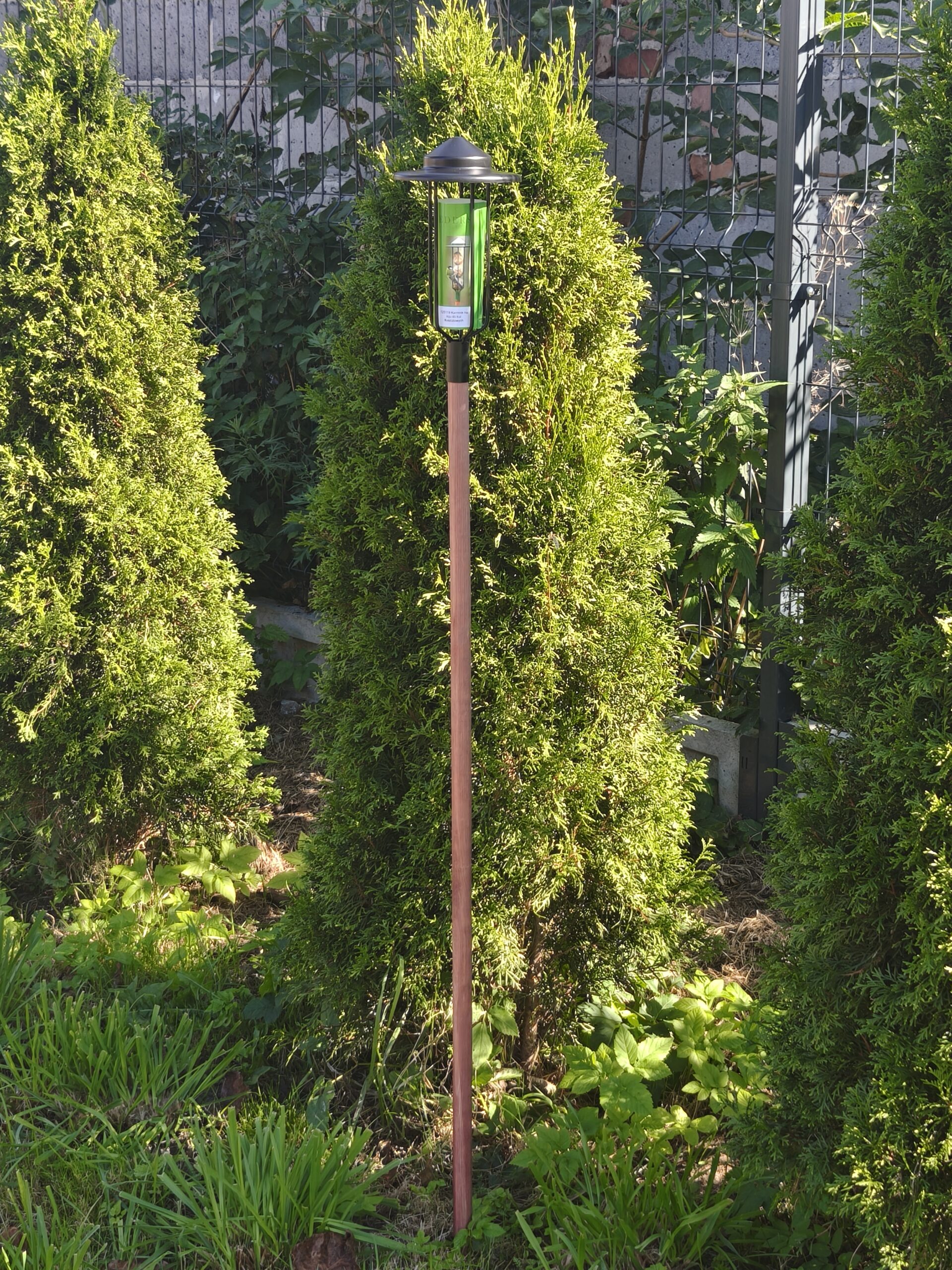 Drewniany kij, zaostrzony na końcu, umożliwia łatwe wbicie karmnika w ziemię.